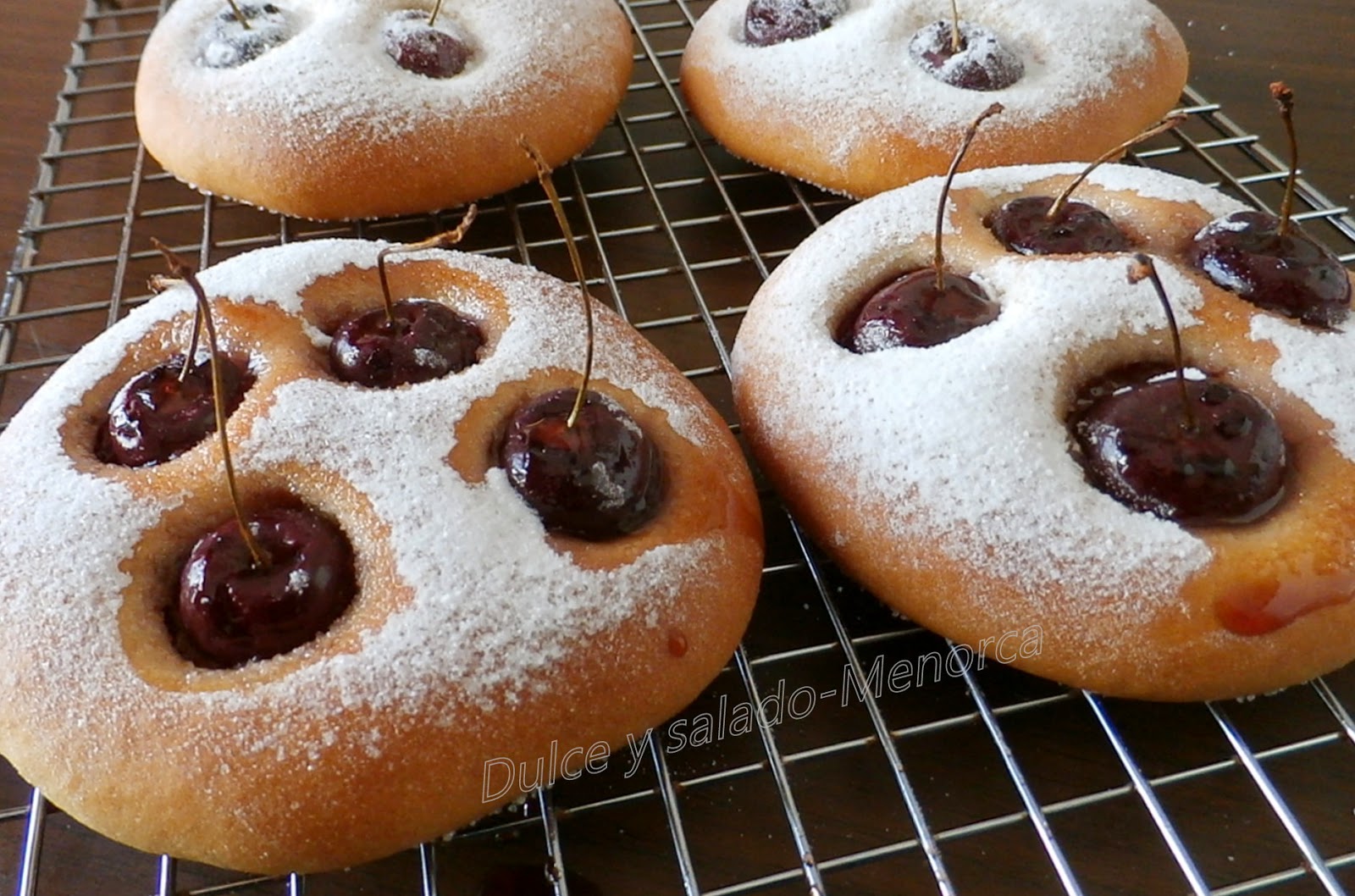 -Poner encima las cerezas con el rabito y apretar para que se hundan. Tienen que quedar clavadas en la masa si no, al cocer subirán.